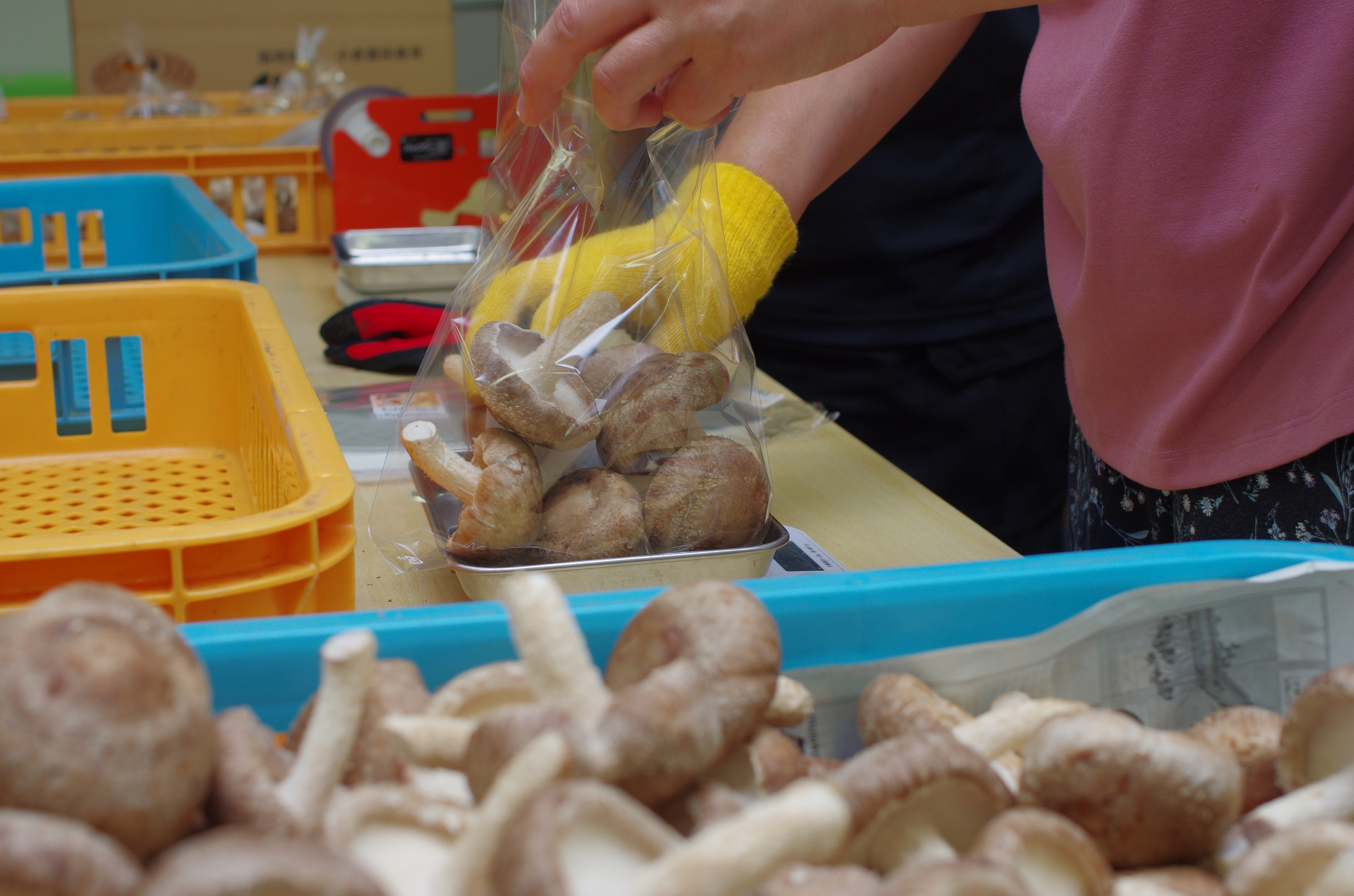 選別の終わったしいたけを、重さを量りながら袋に詰めていきます。